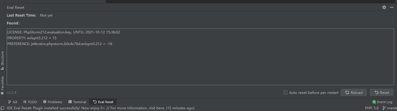 按鈕: Reset 點(diǎn)擊會詢問是否重置試用信息并重啟IDE,選擇Yes則執(zhí)行重置操作并重啟IDE生效,選擇No則什么也不做, 此為手動重置方式